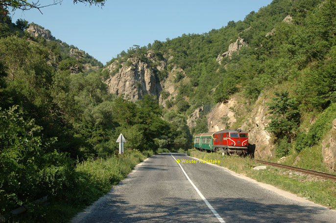 BDZ 77.002 + 5 BDZ coaches as train 16105 (Septemvri, BG - Dobrinishte, BG) at Cepina (BG), 26 June 2005.