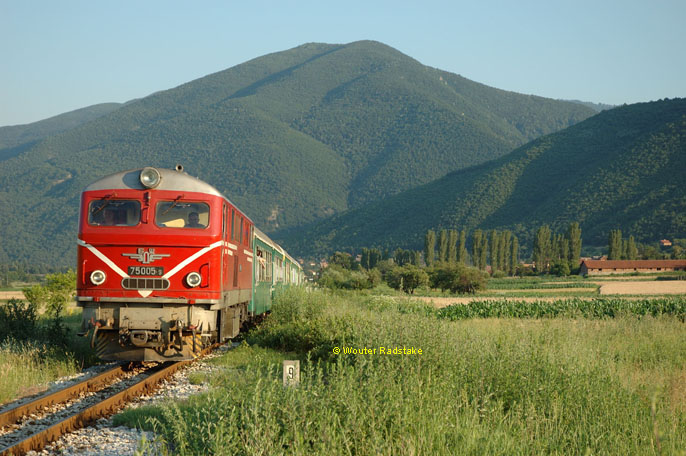BDZ 75.005 + 5 BDZ coaches as train 16106 (Dobrinishte, BG - Septemvri, BG) at Varvara (BG), 26 June 2005.
