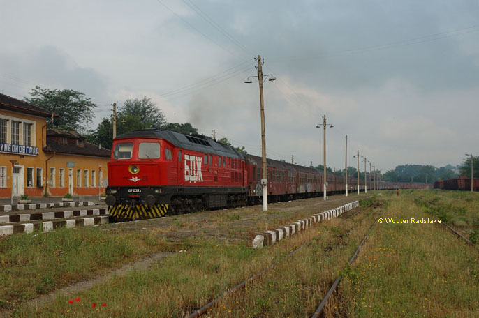 BDZ 07.033 + a lot of ex-DSB coaches on their way from Denmark to Iran via Halkali (TK) at Simeonovgrad (BG), 28 June 2005.