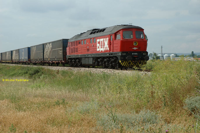 BDZ 07.033 + Mega Combi trailer train from Duisburg (BRD) to Istanbul (TK) at Ljubimec (BG), 28 June 2005.