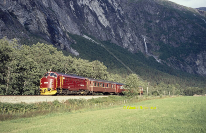 NSB Di3 636 rides with three coaches from Dombas to Andelsnes on the Raumabanen near Flatmark; 23 July 1994.
