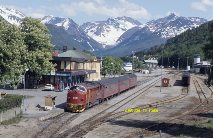In the Andelsnes fjord Di3 641 rests with its coaches before returning as train 2354 to Dombas on 25 May 2000.