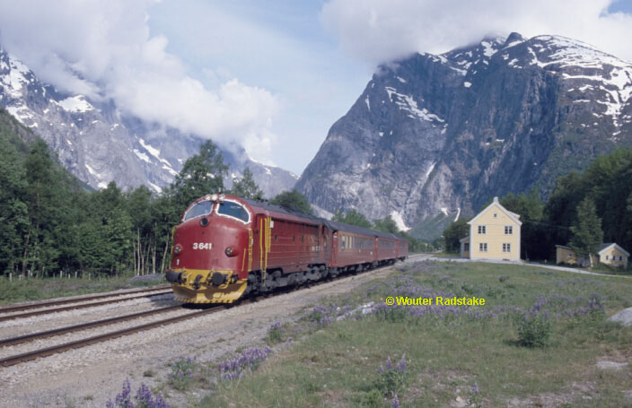Clouds surround the Trollhattan wall as Di3 641 passes the closed Marstein station on its way from Andelsnes to Dombas on 26 May 2000.