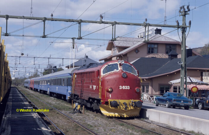On Swedish ground in border station Storlien NSB Di3 633 awaits permission to come off train 385 (Trondheim - Storlien) on 27 May 2000. A Swedih SJ Rc electric locomotive will pull the coaches further to Stockholm in about twenty minutes.
