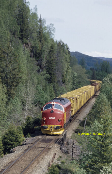 After its passenger working to Storlien (Sweden) NSB Di3 633 returns to Norway (as far as Hell, that's no joke) with a timber train; approaching Guda on 27 May 2000.