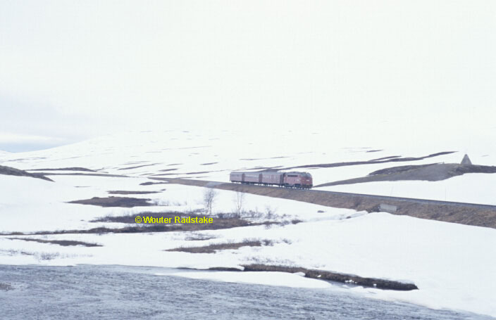 Lonelyness gets a meaning at the Polar Circle Monument, but is broken several times a day when a train passes. Di3 626 accompanies the colded fotographer as it rides alongside the monument with local passenger working 479 (Mosjoen - Bodo) on 30 May 2000.